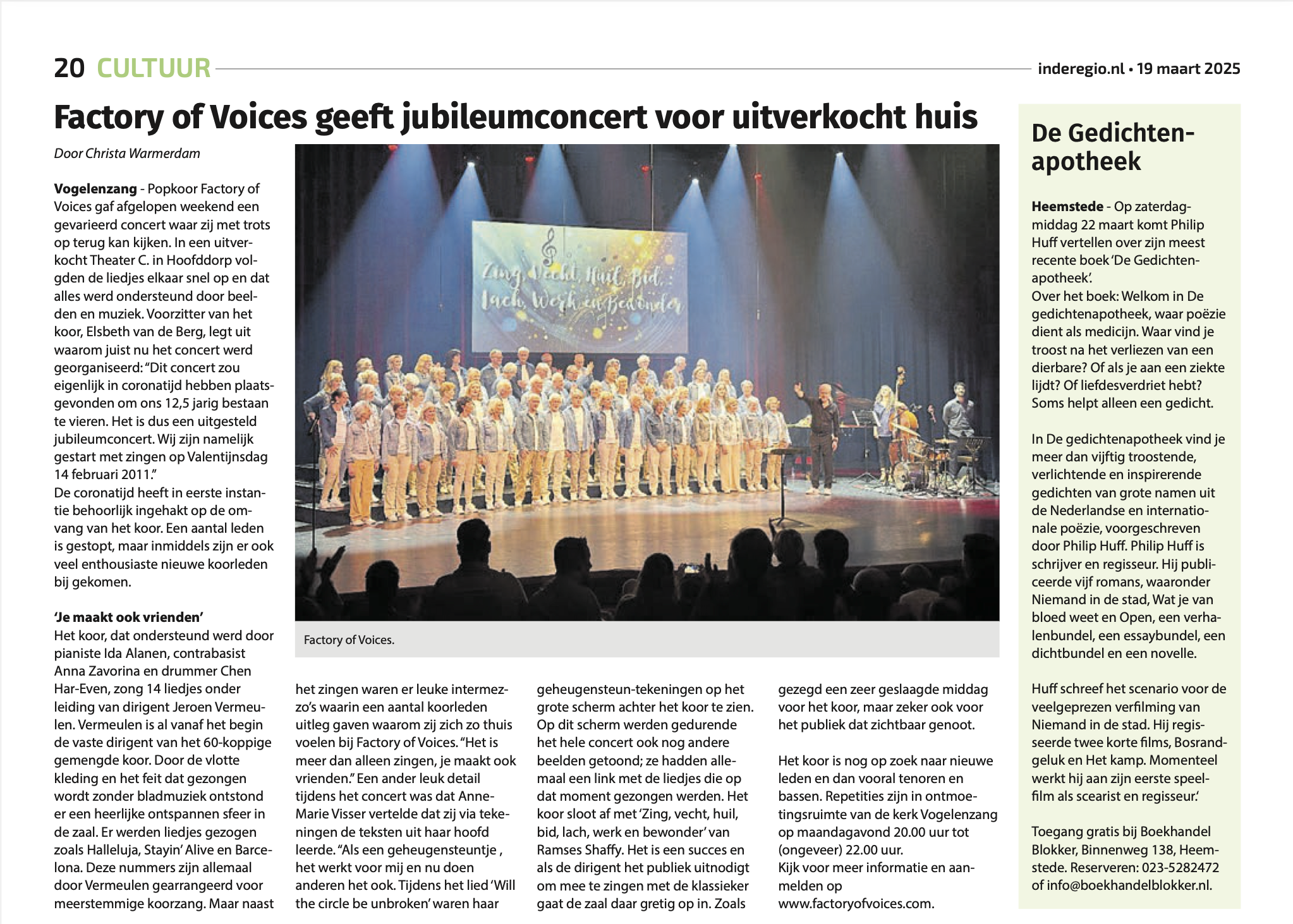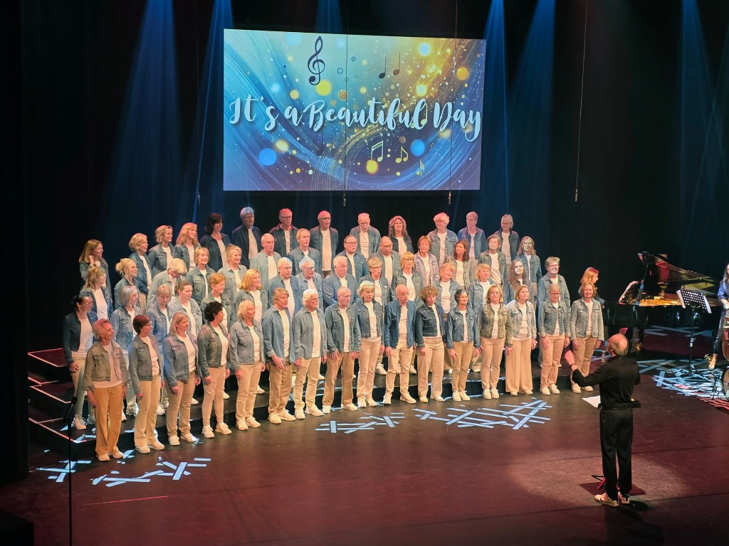 Op zondag 16 maart 2025 vierden wij ons 12,5-jarig bestaan – door corona wat later dan gepland. Meer dan 400 gasten genoten van een optreden in de theaterzaal van CPunt in Hoofddorp, waarin een selectie van liedjes uit ons repertoire werd afgewisseld door korte persoonlijke verhalen van koorleden en een prachtig muzikaal intermezzo gespeeld door een begeleidend combo bestaande uit onze vaste pianiste Ida Alanen, Anna Zavorina op contrabas en Chen Har-Even op drums. Hieronder een foto van het optreden. Wil je recensies lezen? Klik hier voor de bespreking in De Heemsteder.